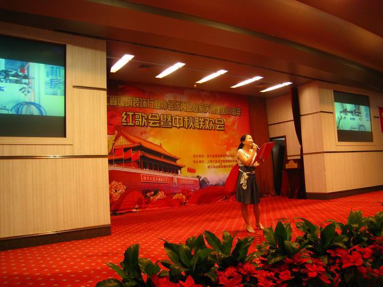 9月25日下午,公司参加了省家装协会举办的庆祝建国60周年红歌会暨中秋联欢会,橱柜部陆美勤进行声情并茂的诗朗诵《问候您,祖国》。博得台下的与会人员的阵阵掌声。此外也在众多的歌舞节目中脱颖而出获得优胜奖。