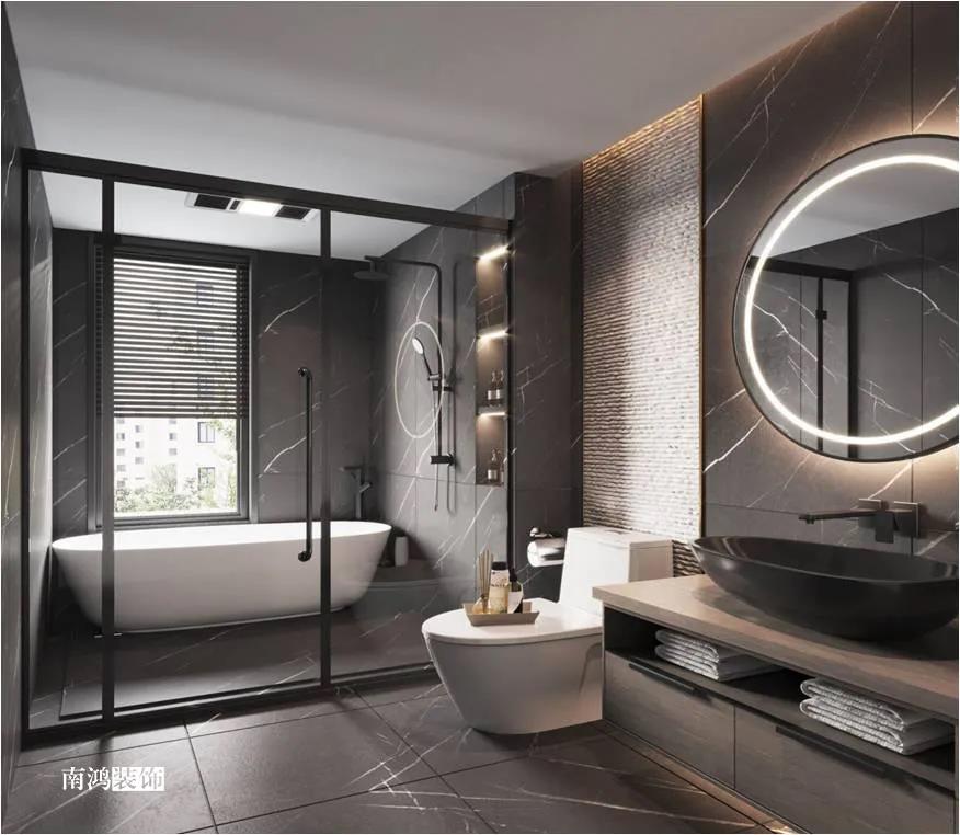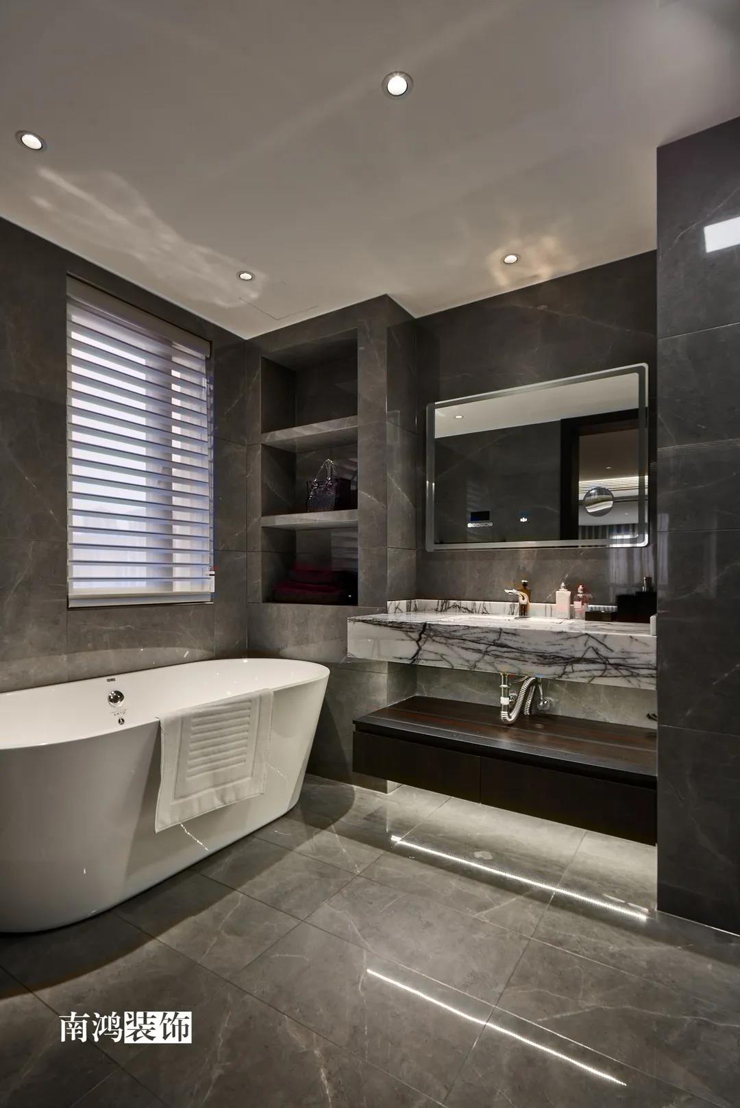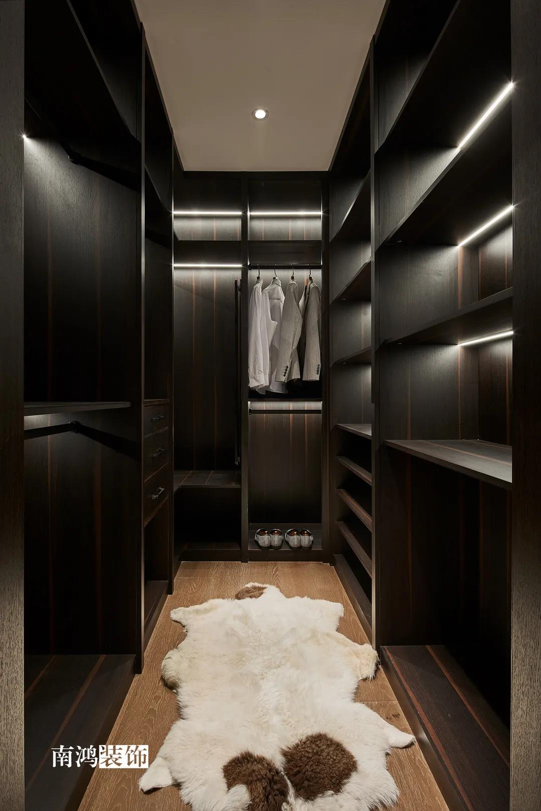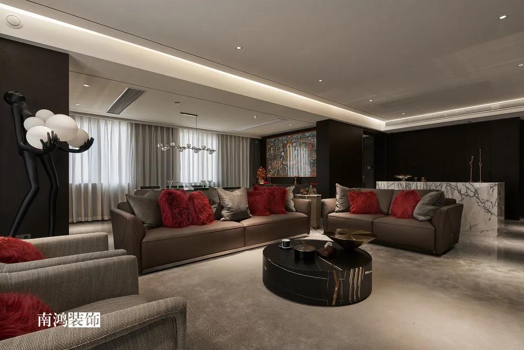 色彩上主要依照男主人的喜好,选择了深色的石材与木饰面,点缀上深红色的软装元素,整体搭配不会太过沉闷,再结合柔和的灯光用以打造空间氛围感,完美诠释“红与黑”主题!