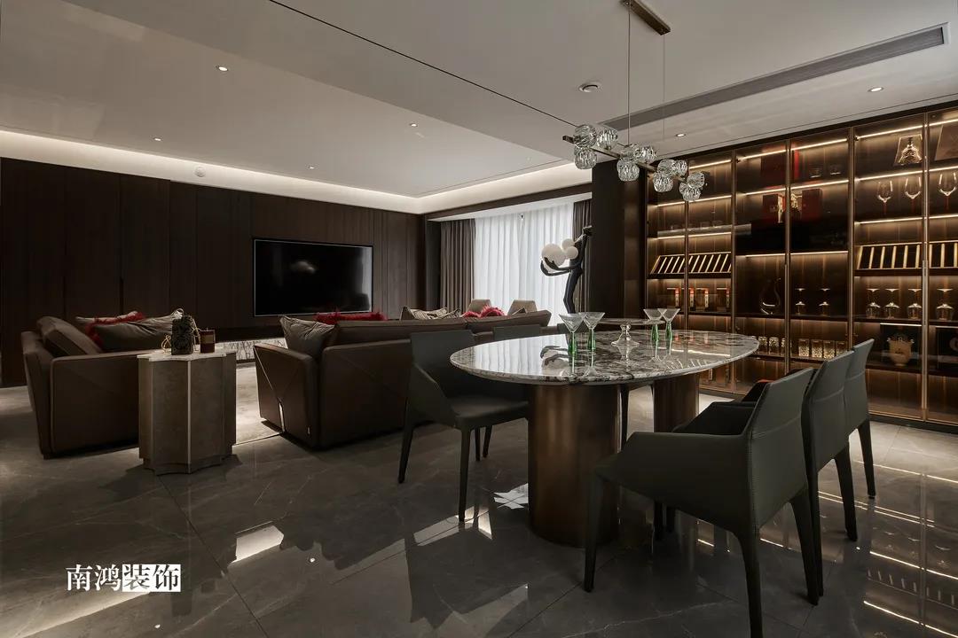 华瑞晴庐本身是200方的大平层户型,但厨、卫、餐、卧房都偏小,因此设计师将空间进行整合规划,尽量放大客餐厨公区域面积,满足客户的日常交际需求。
